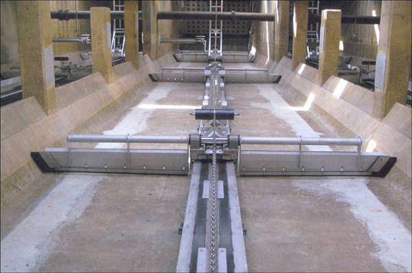 長沉淀池須釆用多車多刮板設(shè)置時,增加連接多車之間的碰桿連接裝置,就能實(shí)現(xiàn)多車運(yùn)行往返翻板同步。